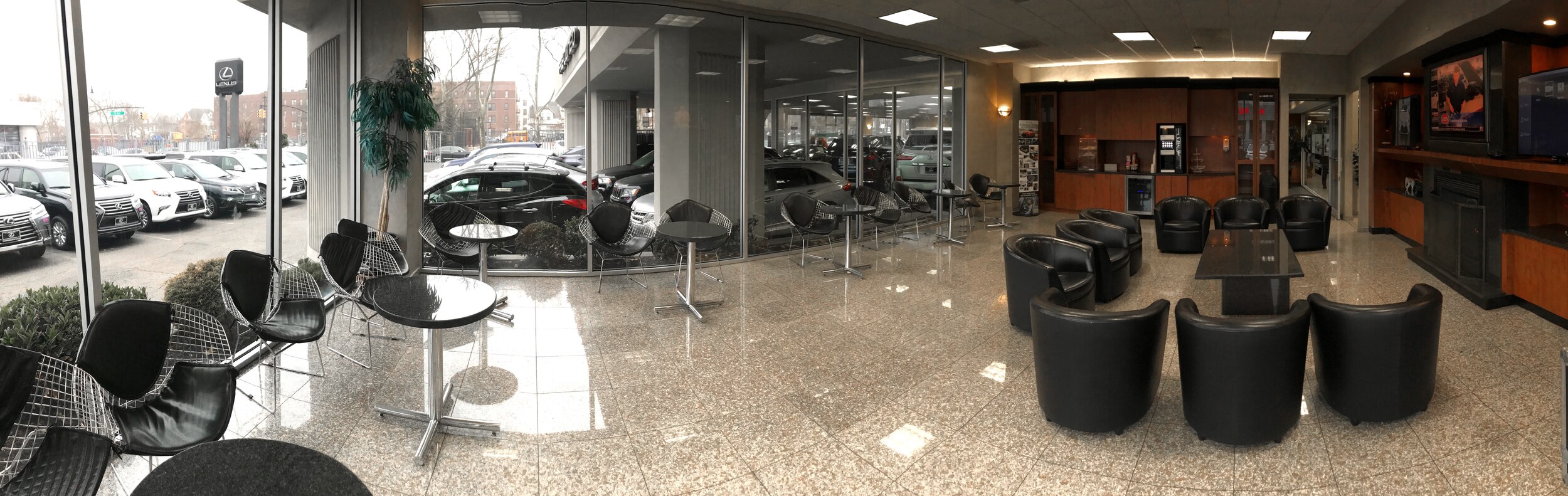 Our customer TV lounge features comfortable seating, modern coffee station and a fireplace to create a homier environment. We have an arrangement of bagels and pastries also for your enjoyment. Please visit Lexus of Brooklyn today.